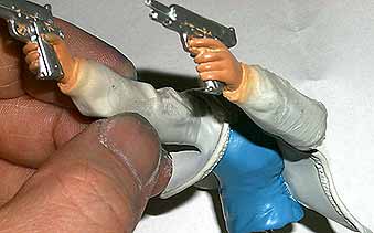 群氏的黑鐵色很透明不易覆蓋,所以上銀底。背心的藍是手油的,因它的曲線比較複雜。在這樣細的部品,加了leveling thinner 的Mr. Color 是可有頗完美的表面。袖子用了Paramfilm M 來覆蓋來噴手。 |