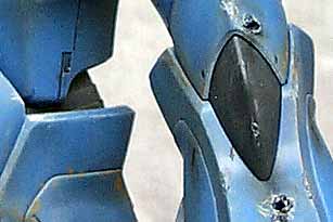 The third type of damage is bullet holes. The effects are different depending the type of ammo hitting the armor. Normal armor piercing bullets creates a simple scratched holes, but explosive ammo can cause some explosion and burn after impact and melt the surrounding armor, and/or out curling of the armor. The first picture are a couple of bullet holes on NT-1's shield from amor piercing bullets. Use a motor tool to create a hole on the shield, then you can either use a knife to cut a jagged depression around the hole, or use the motor tool with an engraver. You can drybrush a little silver inside the jagged edge to simulate the paint scratch from the bullet. The second picture shows the bullet damage on the Gouf's right leg. Here some of the surround armor is melted on impact. I created them using a motor tool with the engraver attachment. First create the hole, then move the engraver around. At high speed the plastic melts, and you get a little curl on the edges. Sometimes it's not easy to preserve the curl, it could get removed on further drilling, so practice a little first. These curls takes washes and drybrushing very well. |