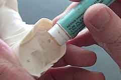 The yellow stuff I smear on her leg is polyester putty. (I use Mori Mori; Bondo and Tamiya Polyester putty are more readily available in the States) This type of putty hardens by chemical reaction between the putty paste and the hardening agent. It doesn't shrink and will become solid in 20-30 minutes. You can use modeling putty such as Squadron or Tamiya, but the problem is they shrink in volume when they dry, so it's not very suitable for the job. |