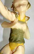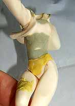I use Magic Sculp epoxy putty (MS) for most filling in this kit. It comes in parts A & B and you knead them together, and the putty will cure in about 3 hours. The cured MS is hard but not brittle, so it's very good for sculpting. Also I bought a set of wax carving sets which is sufficient for detailing her clothes and such. MS is the green stuff. I got rid of bottom half of Ein's shirt and replaced it with the slimmer body of Kirika. The neck flaps of the original sailor school uniform were opened up and MS was put in place for Kirika's vest. The trick here is the vest need to accomodate the head (which includes part of her upper chest). To do this I put the head in place, smear the chest with vaseline, and applied MS around the vest area. The head can then be pulled off. |