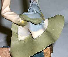I then applied vaseline around the newly created Mori Mori lower body, and wrapped a piece of thin MS around the abodmen. You can use water to smooth MS so that it will perfectly blend into existing MS. This becomes the lower part Kirika's vest and is supposed to wrap around the top part of her miniskirt, which is why I had to go through these steps. I used the spoon-like tool on the wax-carving set to sculpt the wrinkles in. The twisted left waist area would have a lot of those, and the right stretched part would have much less, or so I reasoned. In the picture however I over did it. |