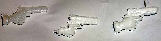 The original kit comes with 3 right hand each holding a different gun (Desert Eagle 50AE, Walther P38 with long barrel, and a 38 Smith and Wesson) , and the left hand holds the long rifle. Of the 3, the Walther looks the most like Kirika's Beretta M-1934 (pardon the sloptitude ya'all gun freaks), so I shortened the barrel and she has some sort of automatic handgun (lower right). I'll try to remember to add that little handle flap that is characteristic of her Beretta. The rifle has to go since she only has one left hand, so I used the dremel to remove the handle of the rifle. At first I wanted to go with the revolver on her left hand since it's the easiest way, so I dremeled the right hand off the revolver and get a free gun that can be attached to the left hand. |