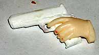After dremeling off the right hand that held the automatic, I glued the left hand onto the handle. There's a lot of heating and bending of the fingers in order to "mold" the palm into the right shape, but the result was near-perfect. |