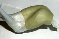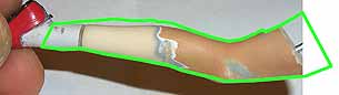 The basic idea of the operation. Green is the original outline of the leg. Here I've already cut off a bit of the thigh and reshaped the lower leg. |
