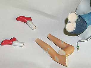 So I decided to fix it. With the correct approach this shouldn't turn into a nightmare. First I sawed off her legs from the bottom of the skirt, essentially reducing the length of the skirt. Then I use a flat steel burr to dremel out the parts of the thighs inside the skirt, which allows me to hide the seams joining the thighs. I also cut off her legs from the sock line, eliminating the need to do mid-calve cuts. |